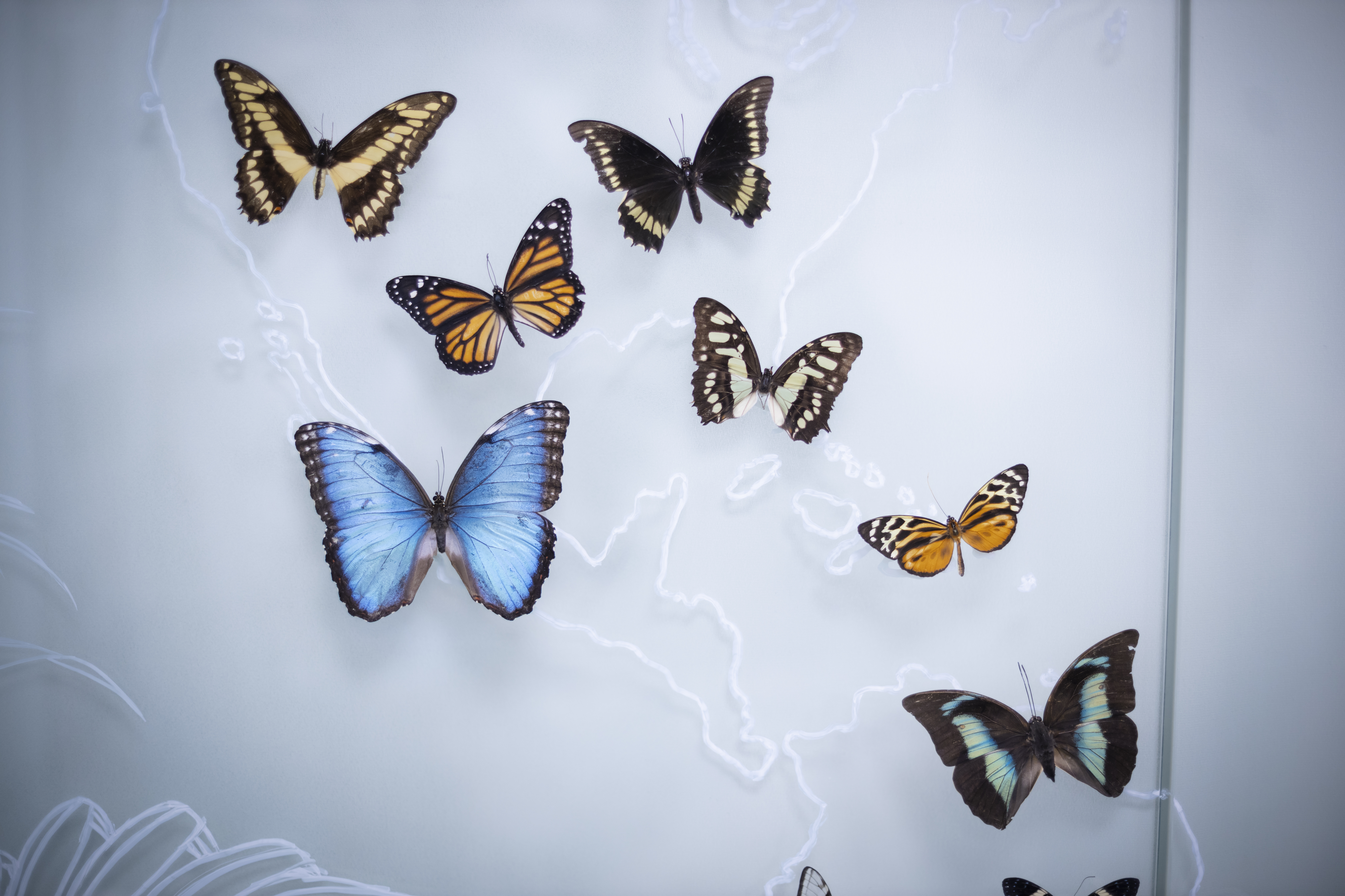 Parodoje nuolat skraido apie 150–300 drugelių, atstovaujančių daugiau nei 20 skirtingų rūšių iš viso pasaulio tropinių regionų.